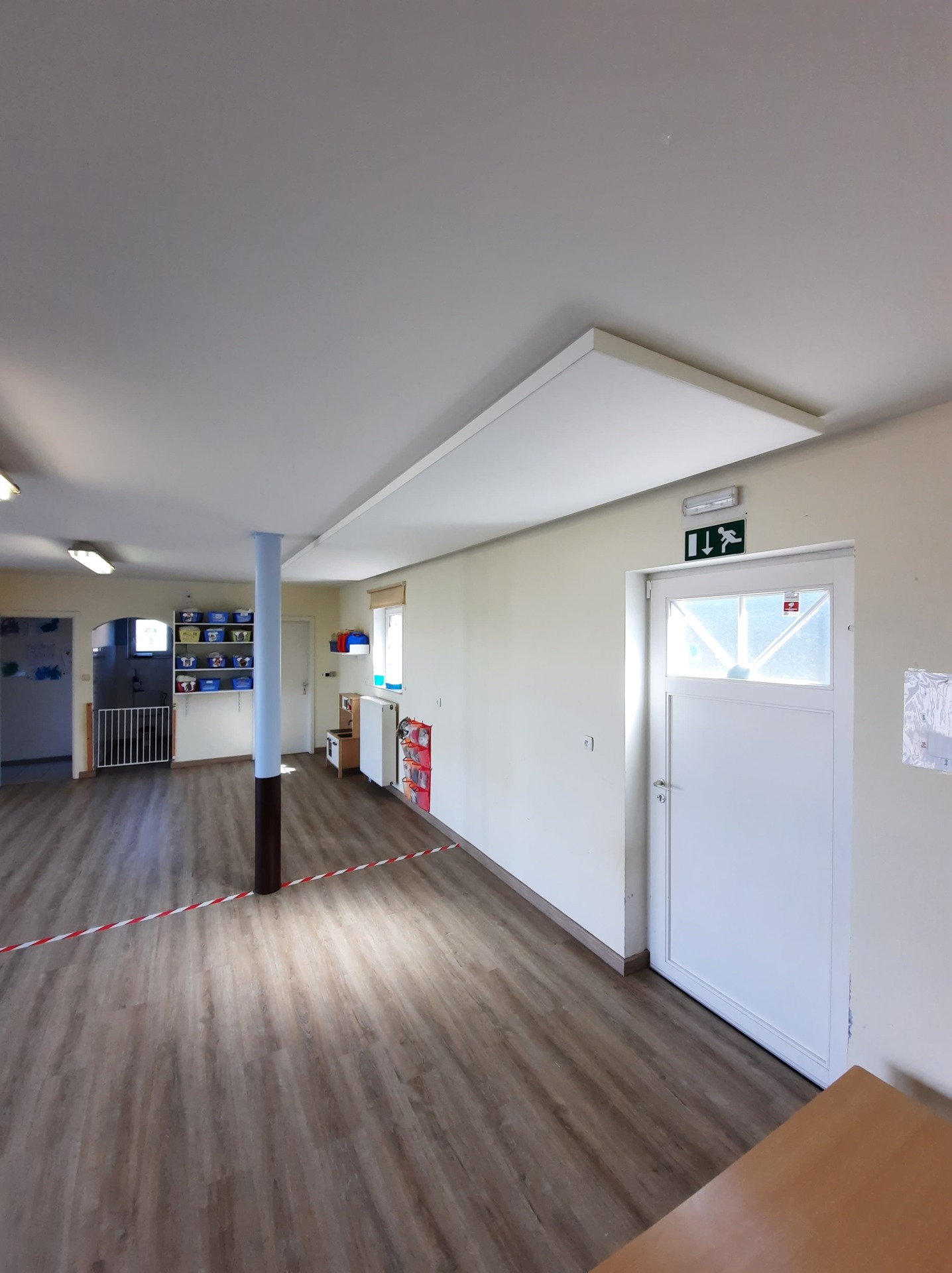 The installation of two COUSTceilings (ceiling panels) in the same color as the ceiling reduced the reverberation time from 1.2 seconds to 0.8 seconds. The acoustic panels have a total surface area of 10 m² and were installed in the center of the room.