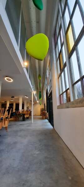 The Provincial Institute for Training and Education (PIVO) is an important training center for fire and police services. In collaboration with Horecapunt, they not only offer high-quality training but also serve delicious meals in their large restaurant. Although the restaurant boasts beautiful architecture and impressive natural light, the acoustics were far from ideal. A remarkable reverberation time of 2.5 seconds was measured in the room, making it clear that action needed to be taken to improve the atmosphere in the space.
